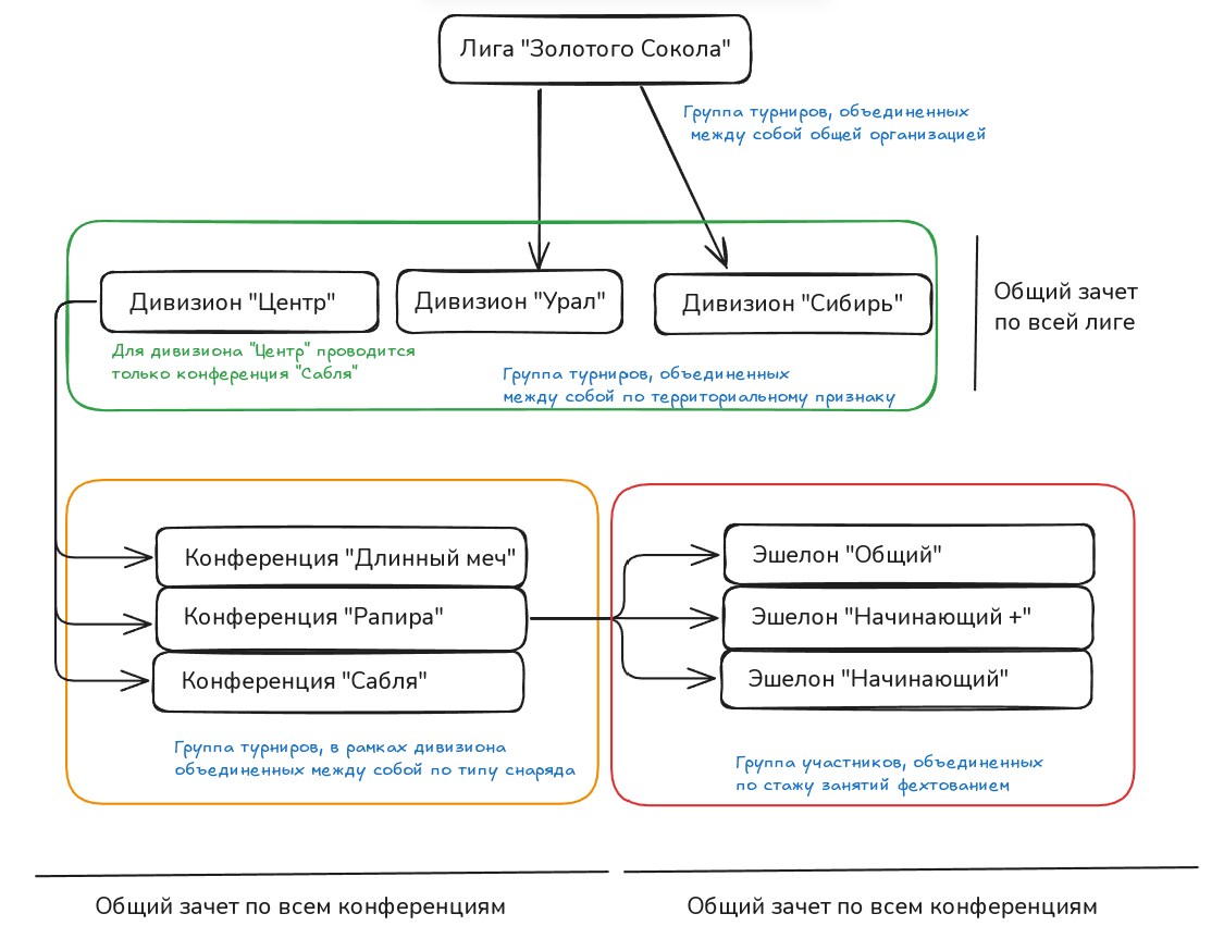 Лига проводится в двух дивизионах. Дивизион — группа турниров, объединенных по территориальному признаку: дивизион “Центр”, дивизион “Сибирь” и дивизион “Урал”. Каждый дивизион (за исключением дивизиона “Центр”) состоит из 9 турниров по направлениям длинный меч, рапира, сабля, использующим следующий набор правил: